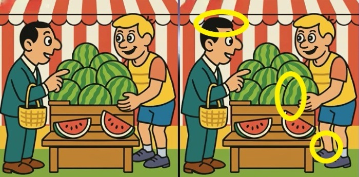 Så, är du redo för utmaningen? Ta en närmare titt på de två bilderna av en man som köper en vattenmelon. Till en början ser bilderna kanske likadana ut, men det finns 3 små skillnader. Tror du att du kan hitta dem alla på 27 sekunder? Prova och testa din synskärpa!