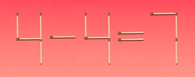 Nedan ser du en bild där likheten 4-4=7 läggs ut med hjälp av tändstickor. Uppenbarligen finns det ett fel här, eftersom svaret borde vara 0.